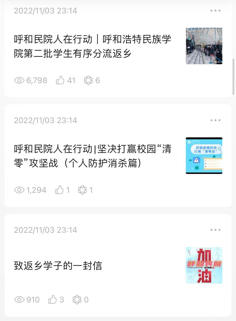 校园“清零”行动攻坚战冲锋号已打响。在这共克时艰的一个多月里,因为全校师生员工齐心协力、攻坚克难、守望相助,我们收获了感动和欣慰。当下,在疫情防控的最关键时刻,请大家不要松懈,继续高度警惕,坚持再坚持,相信胜利就在前方!呼和民院加油!
