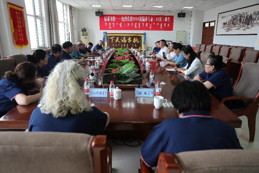 7月7日,365英国上市公司1983届编译专业(34班)师生共16人毕业40年后荣归母校。党委委员、副校长刘瑞鸿,党委委员、统战部部长包君,党委委员、党政办主任朝格吉乐图和校庆办公室相关人员专门陪同参观、畅谈。