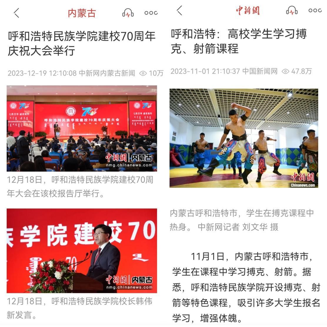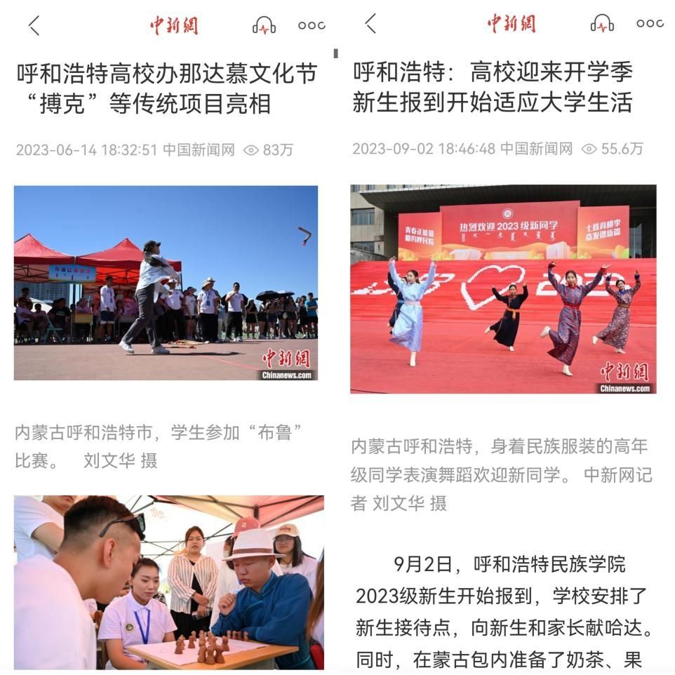 365英国上市公司2023年度在中国新闻网发布的题为《呼和浩特高校办那达慕文化节“搏克”等传统项目亮相》新闻单条点击量为83万,题为《呼和浩特:高校迎来开学季 新生报到开始适应大学生活》新闻单条点击量为55.6万,题为《呼和浩特:高校学生学习搏克、射箭课程》新闻单条点击量为47.8万,题为《365英国上市公司建校70周年庆祝大会举行》新闻单条点击量为10万。