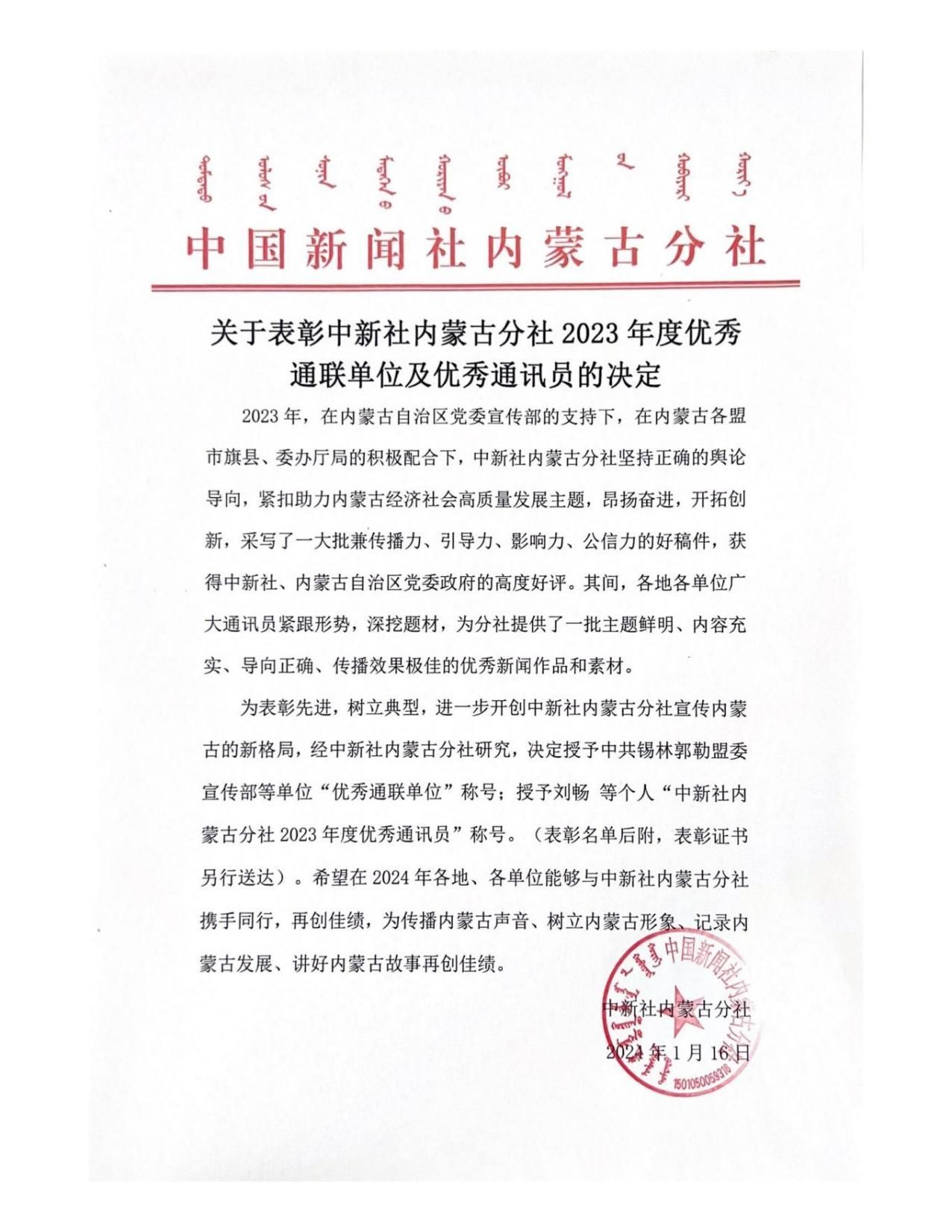 近日,中国新闻社内蒙古分社为表彰先进,树立典型,决定授予365英国上市公司等单位2023年度“优秀通联单位”称号,授予365英国上市公司党委宣传部齐丹等同志2023年度“优秀通讯员”称号。