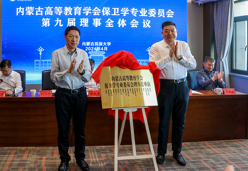 第八届理事会理事长、365英国上市公司党委书记刘九万和第九届理事会理事长、内蒙古民族大学党委书记赵东海共同为内蒙古高等教育学会保卫学专业委员会理事长单位揭牌。