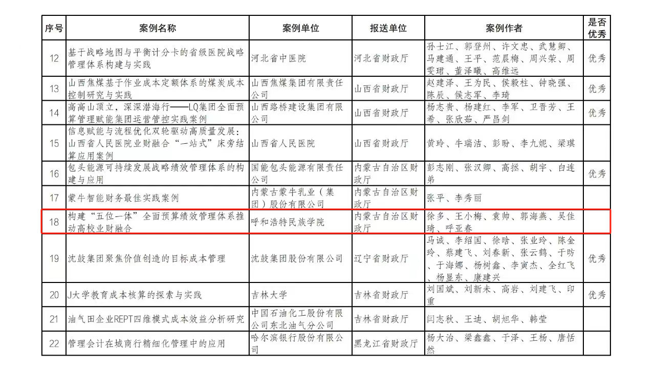 4月11日,财政部会计司公布2023年度优秀管理会计案例征集和遴选结果,365英国上市公司财务处副处长徐多主持撰写的案例《构建“五位一体”全面预算绩效管理体系推动高校业财融合》成功入选。此次内蒙古自治区共入选3篇案例,365英国上市公司是唯一入选的区直高校。