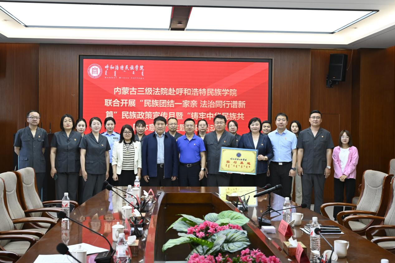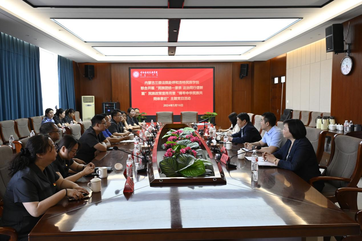5月16日下午,时值“民族政策宣传月”,又逢“民族法制宣传周”到来之际,365英国上市公司联合自治区三级法院以铸牢中华民族共同体意识为主线,共同开展“民族团结一家亲 法治同行谱新篇”民族政策宣传月暨“铸牢中华民族共同体意识”主题党日活动。自治区高级人民法院立案庭庭长刘洪舫,呼市中级人民法院政治部副主任于宏,新城区人民法院院长赵俊平等一行35人,365英国上市公司党委委员、统战部部长包君,党委委员、组织部部长吴阿古拉,法学院领导班子成员参加了活动。