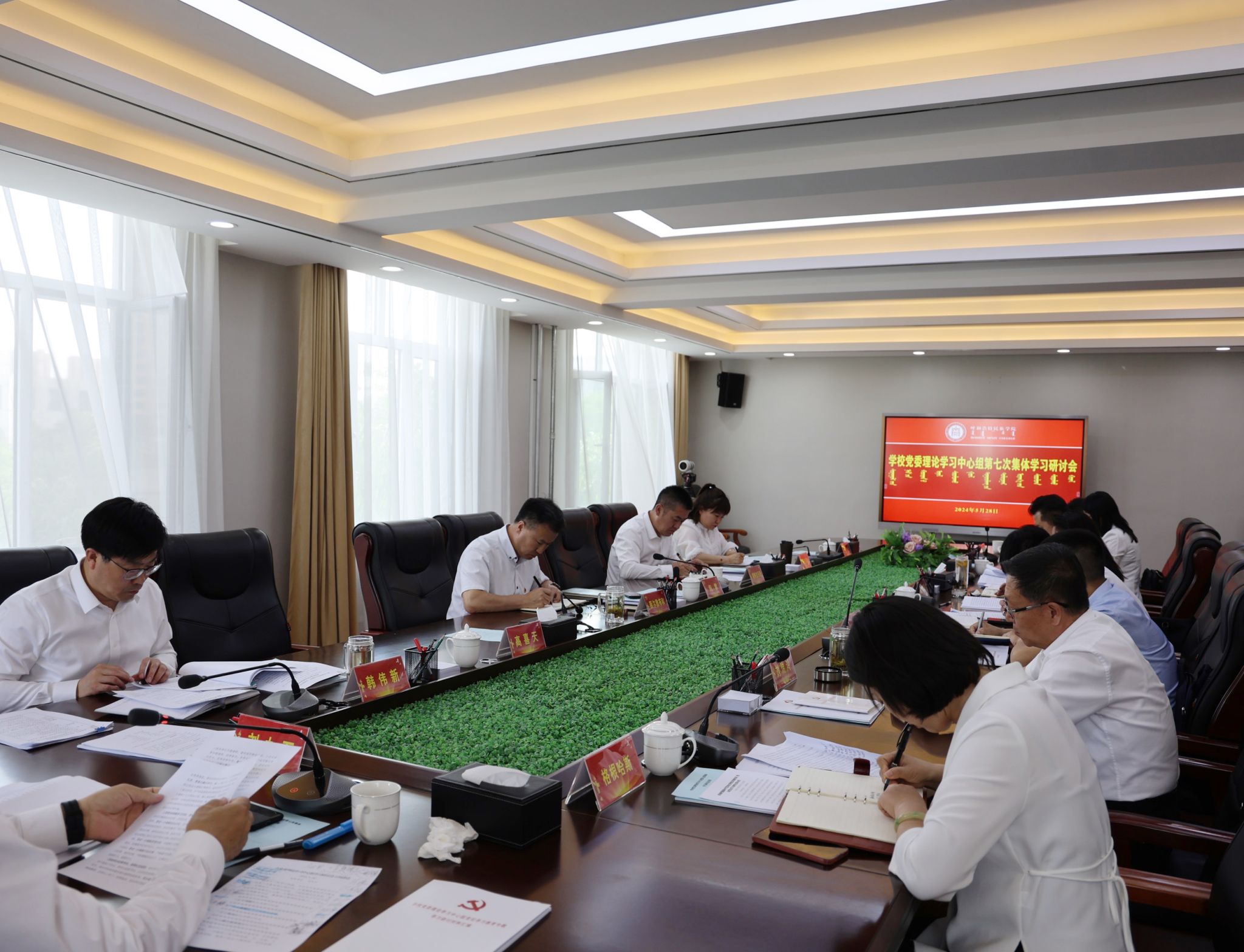 为深入学习贯彻习近平总书记关于党纪学习教育的重要讲话、重要指示精神,切实把思想和行动统一到党中央决策部署上来,推动党纪学习教育走深走实,带动学校各项工作顺利开展,5月28日下午,学校在办公楼三楼会议室召开党委理论学习中心组第七次集体学习研讨会,紧扣党纪学习教育专题,进行交流研讨。校党委书记刘九万主持会议并讲话。校党委副书记、校长韩伟新,党委委员、副校长刘瑞鸿,党委委员、副校长额尔敦布和作了现场交流,其他中心组成员作书面交流。党委理论学习中心组成员参会。