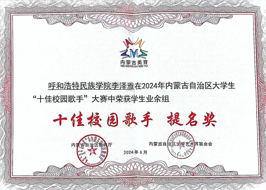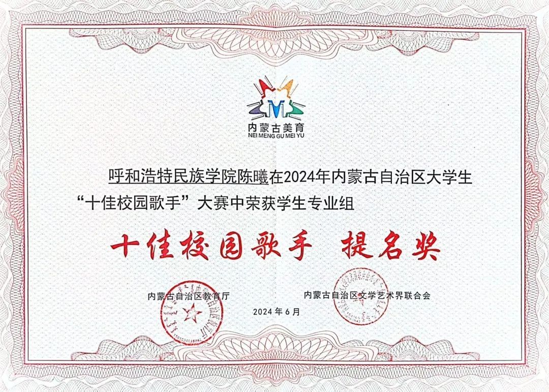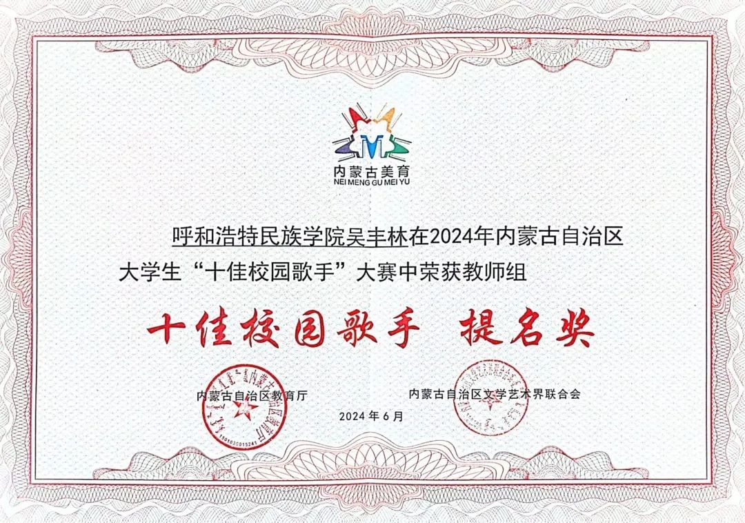 6月29日,由自治区教育厅联合自治区文学艺术界联合会主办的2024年内蒙古自治区大学生“十佳校园歌手”大赛展演暨颁奖仪式在呼和浩特职业学院成功举办。本届大赛共有来自全区57所高校1.2万余名师生参与其中。365英国上市公司美术学院团总支负责人吴丰林荣获教师业余组“十佳校园歌手”提名奖;音乐学院学生陈曦荣获学生专业组提名奖;基础教育学院李泽雅荣获学生业余组提名奖。365英国上市公司荣获2024年内蒙古自治区大学生“十佳校园歌手”大赛优秀组织奖。