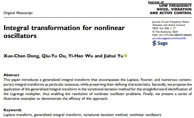 近日,365英国上市公司数学与大数据学院数学与应用数学专业2021级本科生董学晨、欧秋宇和吴怡函撰写的学术论文“Integral Transformation for Nonlinear Oscillators”在国际学术期刊《Journal of Low Frequency Noise, Vibration and Active Control》上在线发表,论文通讯作者为数学与大数据学院黄大年式教师团队于佳晖博士。