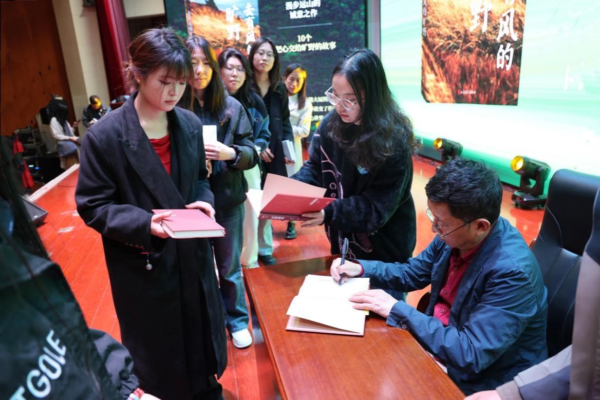 师生纷纷上台与阿来老师近距离沟通交流,阿来老师也在书页上留下了对同学们的祝福。这一场景不仅彰显了师生们对文学的热爱,更体现了他们对阿来作品及其创作理念的浓厚兴趣。