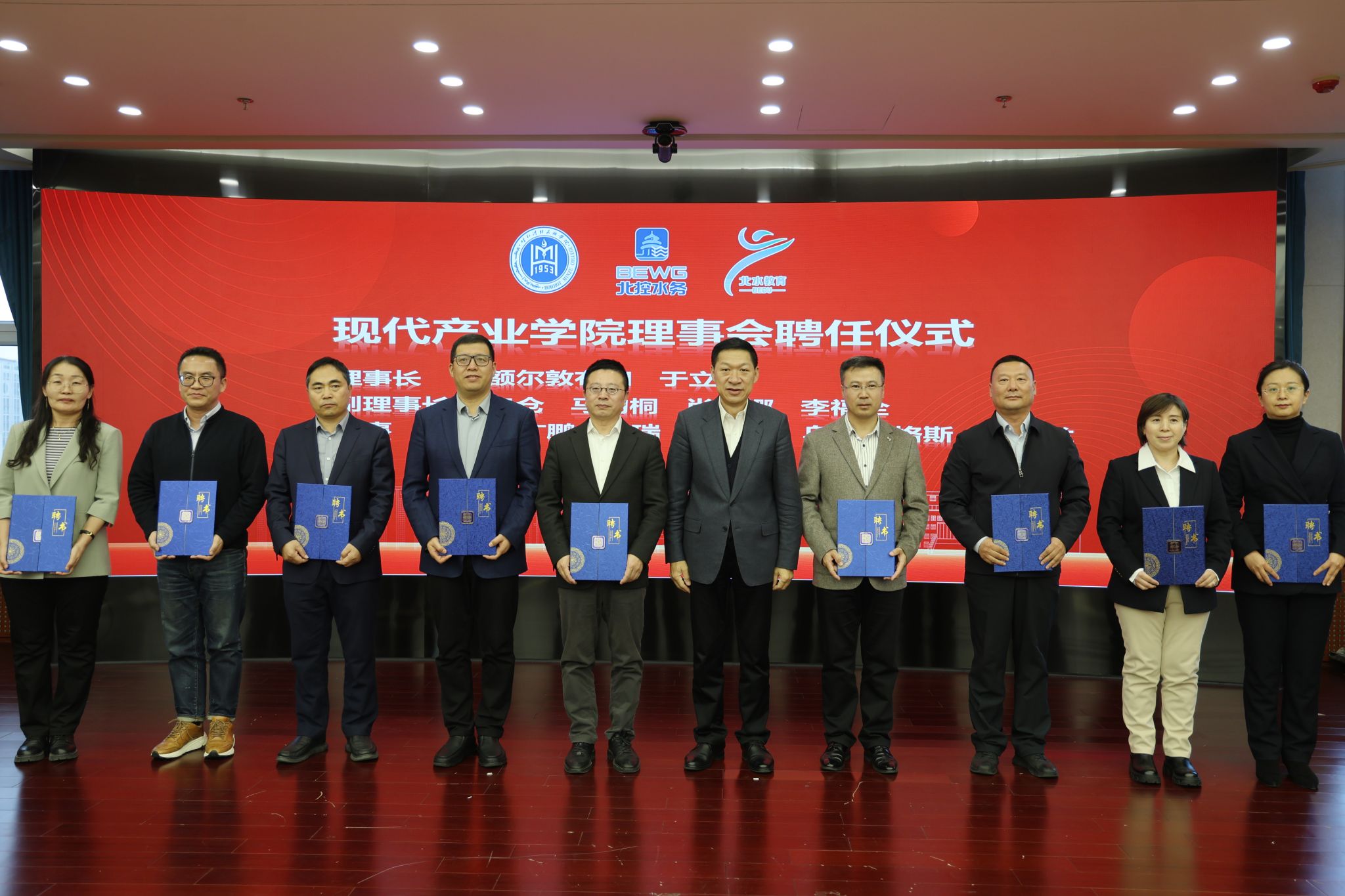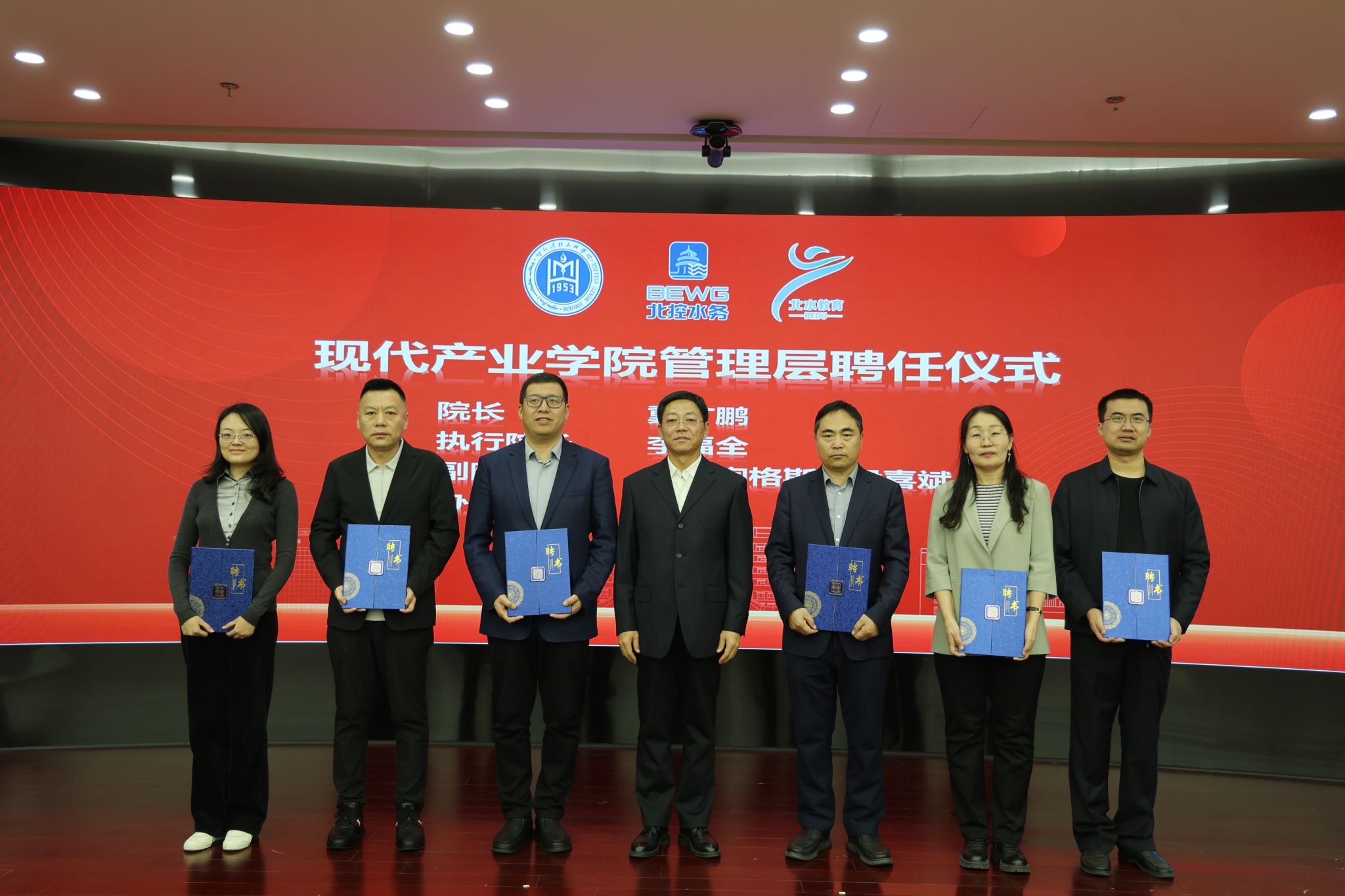 高喜天代表学校为现代产业学院管理层颁发聘书,冀广鹏理事兼任现代产业学院院长,李福全副理事长兼任现代产业学院执行院长,乌仁陶格斯、殷喜斌任现代产业学院执行副院长。