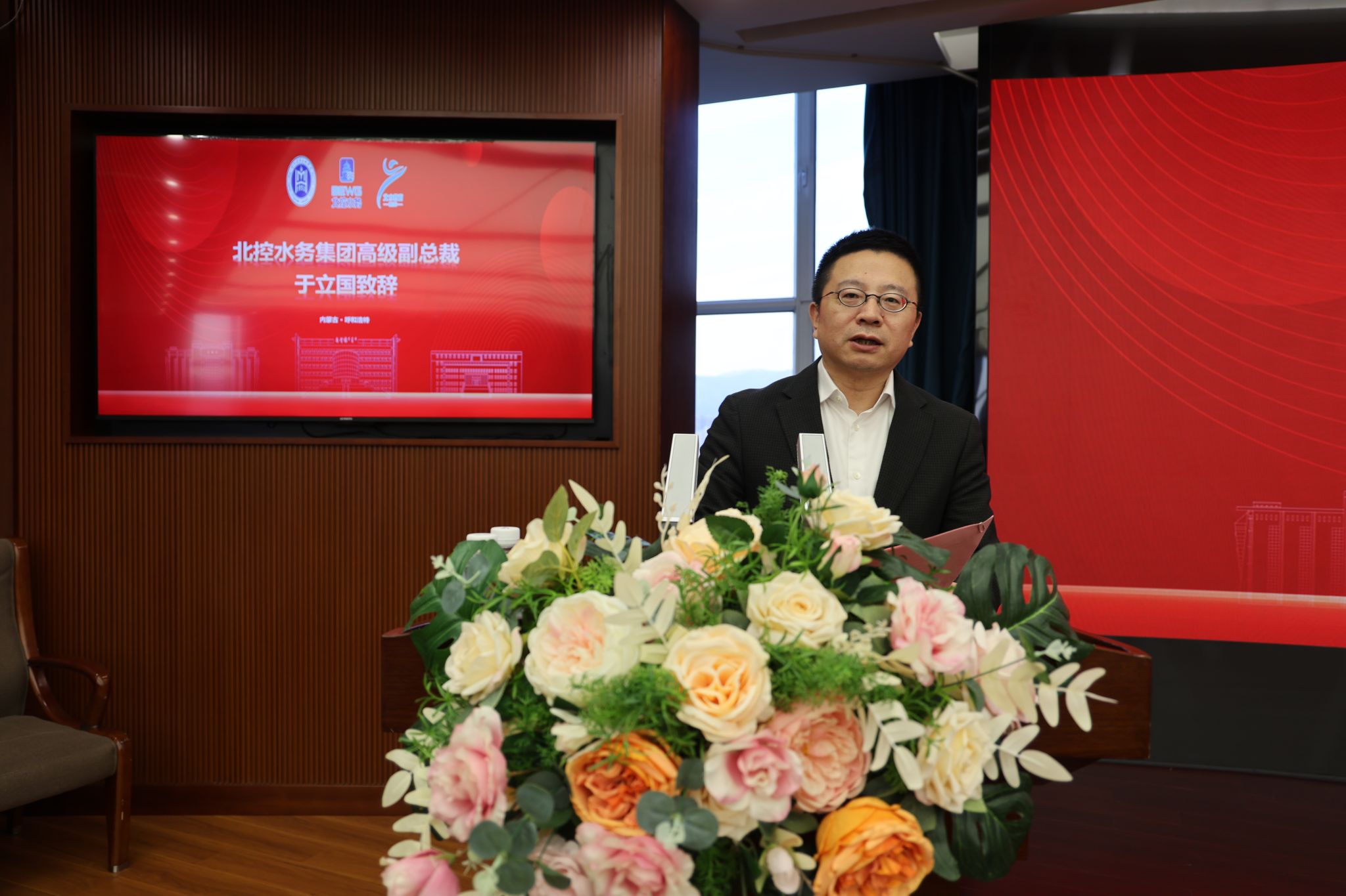 于立国在致辞中介绍了北控水务集团概况,以及在产教融合领域十多年探索实践取得的丰硕成果。他表示,北控水务高度重视此次合作,认为学校人才培养理念与北控水务集团的发展理念与方向高度契合,期望以共建产业学院为契机,开拓校企合作领域,深化校企合作内涵,将教育深度融入产业发展中,协同发挥资源优势,全面助力生态环境类高等教育进步发展。