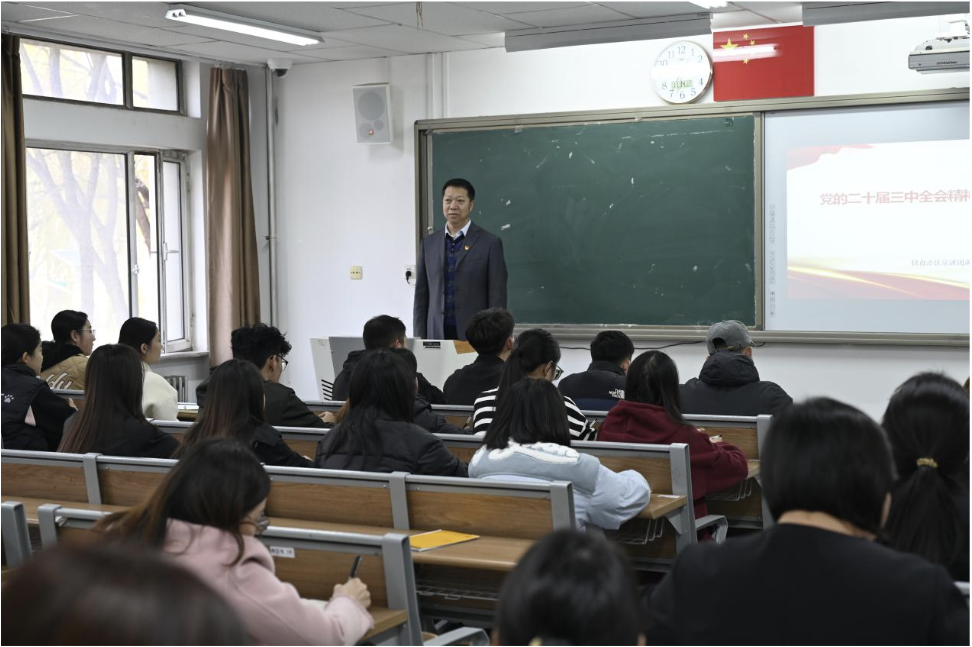 为深入学习宣传贯彻党的二十届三中全会精神,加强党的思想政治引领,校党委委员、副校长双虎于11月14日下午在尚智楼205教室为法学院师生讲授以《深入学习贯彻党的二十届三中全会精神》为题的专题党课。法学院23级法学二班全体同学及法学院全体教师聆听了党课。
