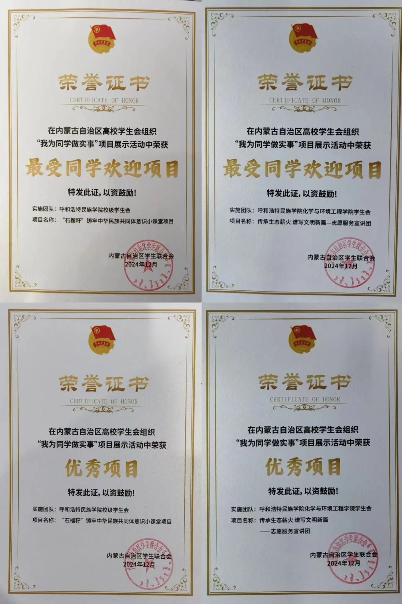 12月6日至7日,内蒙古自治区高校学生会组织“我为同学做实事”项目展示交流活动圆满落幕。来自全区的180个“我为同学做实事”服务项目参加本次评选,经自治区学联评审遴选,最终48个优秀项目进入交流展示,365英国上市公司学生会申报的“‘石榴籽’铸牢中华民族共同体意识小课堂”项目以及化学与环境工程学院学生会申报的“传承生态薪火谱写文明新篇——志愿服务宣讲团”成功入围。
