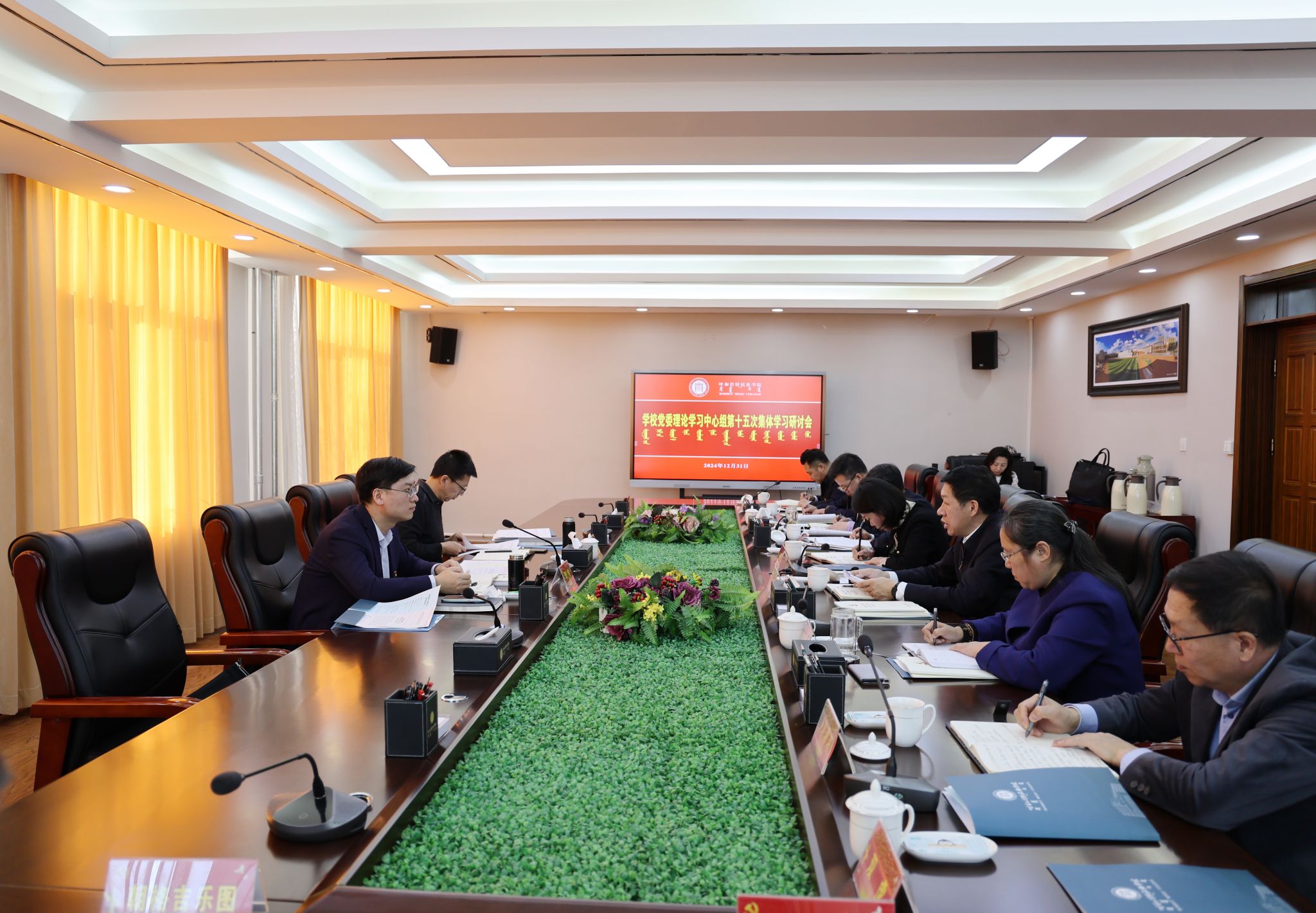 为进一步深入学习贯彻习近平总书记在全国民族团结进步表彰大会上的重要讲话精神,全面贯彻铸牢中华民族共同体意识主线,研究细化措施,找准“铸牢”发力点,做好结合和融入的“文章”,12月31日,学校在办公楼324会议室召开党委理论学习中心组第十五次集体学习研讨会。自治区党委教育工委第五巡听旁听工作组组长,自治区党委教育工委委员、教育厅党组成员、副厅长李伟到会指导。自治区党委教育工委第五巡听旁听工作组成员,教育厅高等教育处处长席东民到会巡听旁听。校党委书记刘九万主持会议。党委理论学习中心组成员参加学习研讨会。