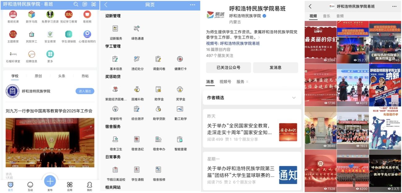 未来,易班发展中心将继续坚持“一体两翼”(易班平台为主体,微信公众号、视频号平台为两翼)的建设与发展模式,破解易班发展瓶颈,进一步着力构建网络思想政治教育矩阵,探索具有呼民院特色的网络育人新体系,为新时代大学生思想政治教育工作高质量发展添翼赋能。