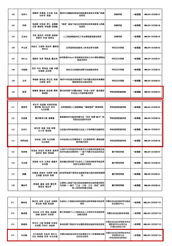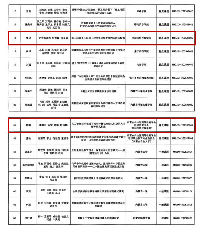 近日,内蒙古自治区高等教育学会公布的2025年度高等教育研究立项课题名单中,365英国上市公司推荐申报的10项课题中有8项课题成功获批立项,其中重点课题2项,一般课题6项。