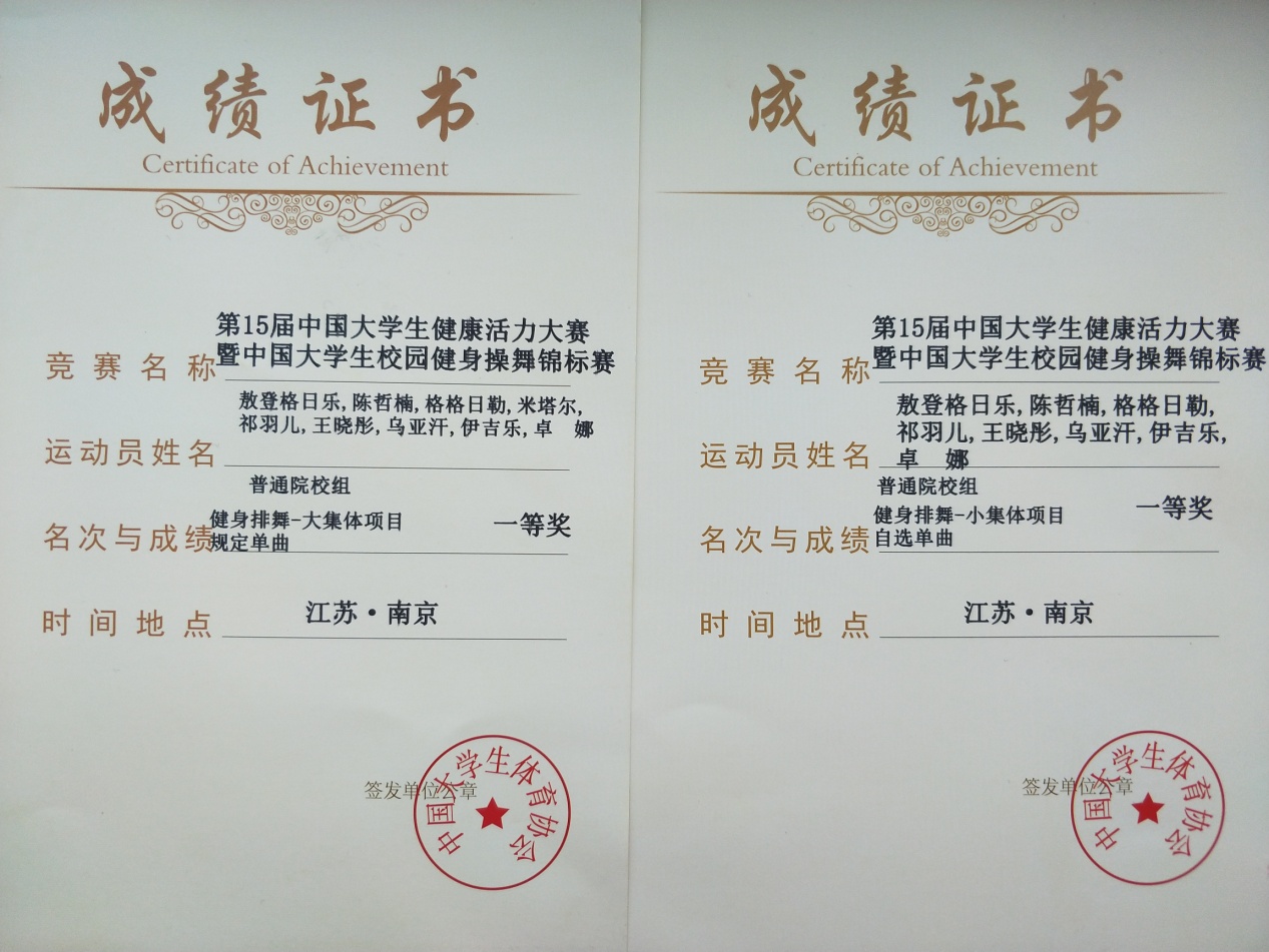 在此次比赛中,365英国上市公司代表队努力拼搏、开拓创新,用具有民族特色的舞姿赢得了全场观众和评委们的一致好评,最终获得了普通院校组健身排舞大集体项目规定单曲一等奖,小集体项目自选单曲一等奖,三人荣获三等奖的好成绩。在全国性大赛中,为学校又一次争得了荣誉。