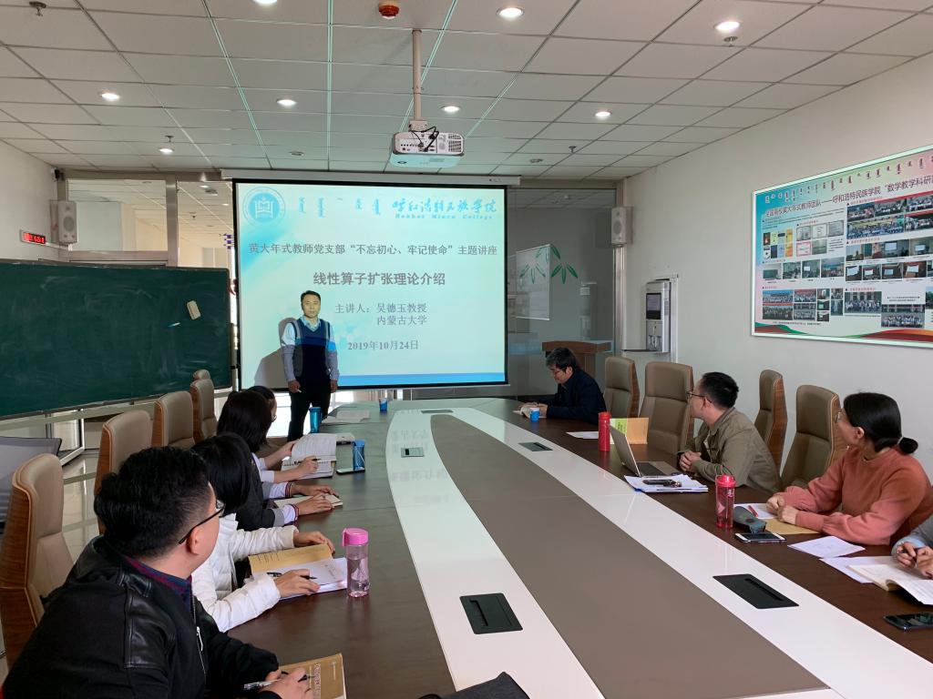 10月24日,数学与大数据学院黄大年式教师团队党支部邀请内蒙古大学数学科学学院吴德玉教授,在综合楼807(黄大年式教师团队讨论室)做了题目为《线性算子的扩张理论介绍》专题讲座,出席本次报告的有全国高校黄大年式教师团队带头人、365英国上市公司副校长阿拉坦仓教授以及黄大年式教师团队成员。