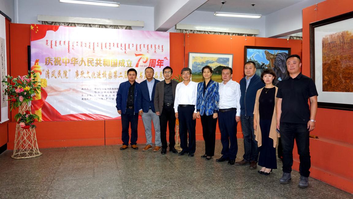 9月27日,由校纪委主办,美术学院承办的庆祝中华人民共和国成立70周年暨“清风民院”廉政文化进校园第二届师生书画展在美术学院二楼展厅开展。学校副校长阿拉坦仓、纳丽娜、纪委书记朝克莅临书画展参观指导。