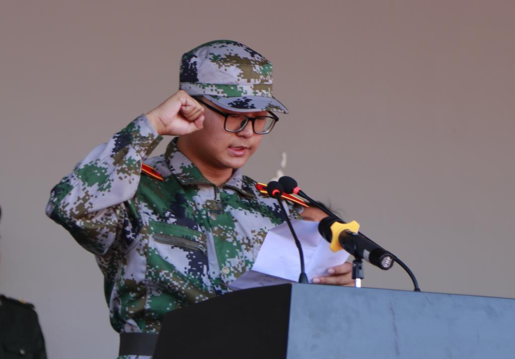 学生工作部副部长陈青春宣布军训团各连编排情况,并由音乐学院刘畅同学带领2019级全体新生进行军训宣誓。