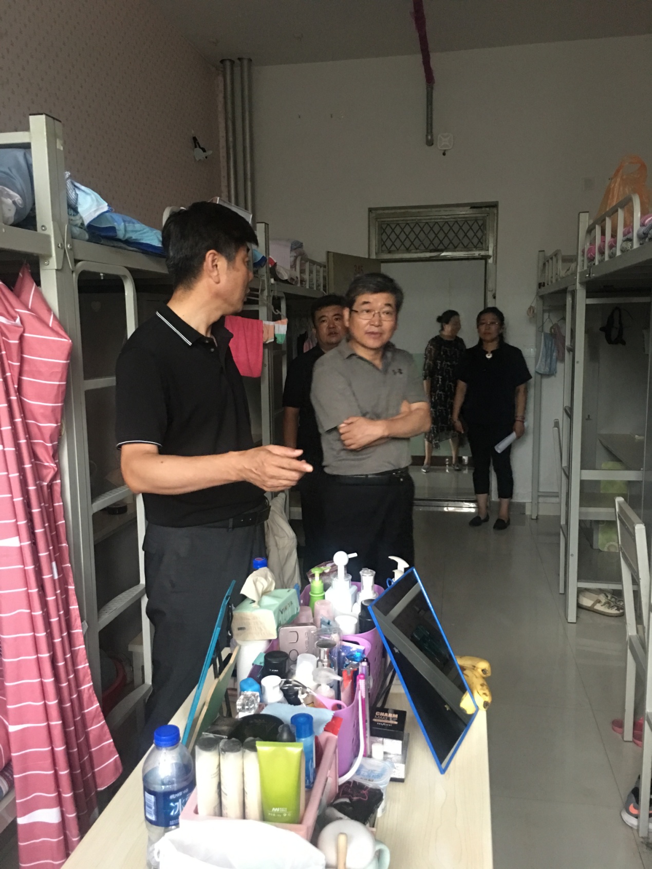 7月13日,学校领导孙国权书记、阿拉坦仓副校长、贺希格吉雅副校长在党政办公室、学生工作部、保卫处、后勤管理处等部门负责人陪同下,就安全保卫、后勤服务、学生管理等工作,深入学校校门及楼宇门卫、学生食堂、学生生活区等区域进行了暑期安全检查。