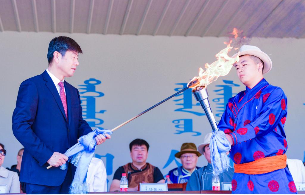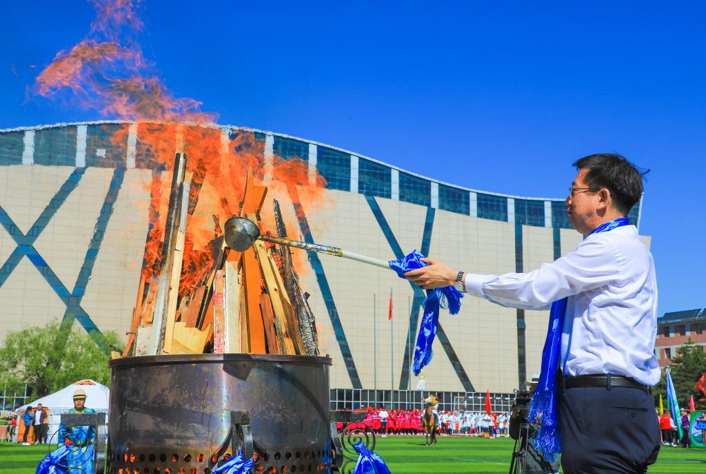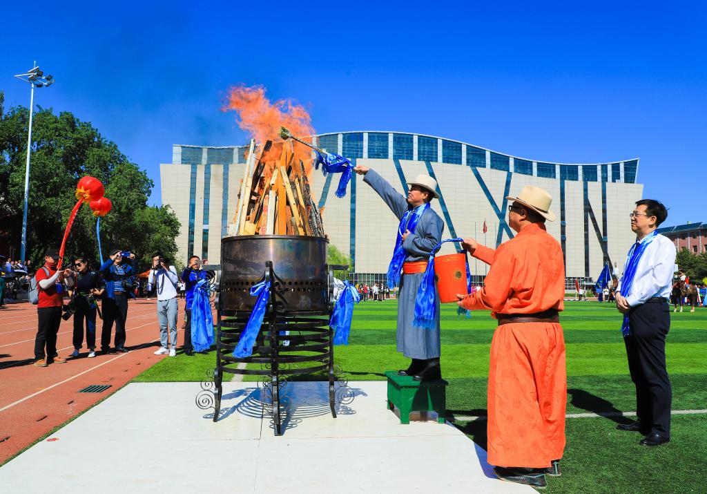 学校党委书记孙国权点燃象征着体育精神的圣火,由火炬手传递圣火种,最后体育学院白图日根点燃了圣火盆。