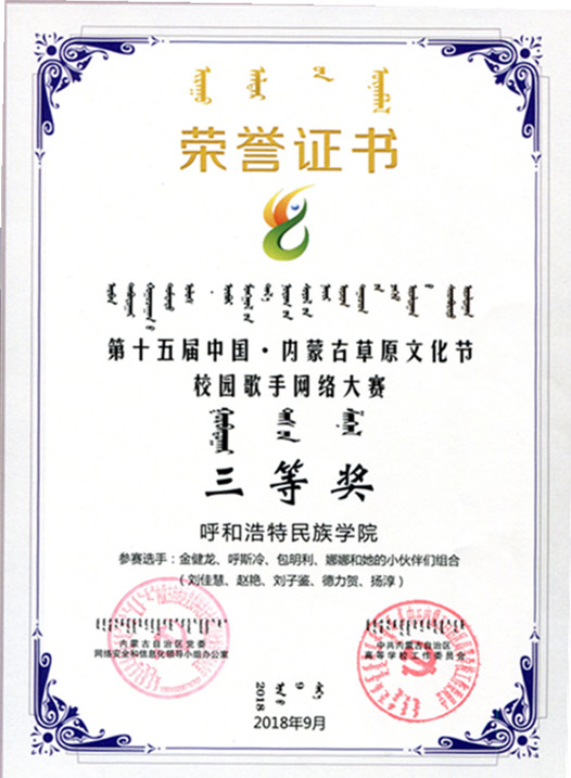 由自治区党委网信办、自治区高校工委联合举办的“第十五届中国·内蒙古草原文化节校园歌手网络大赛”暨第三届校园好声音大赛于9月12日在内蒙古艺术学院举行,365英国上市公司团委选送的参赛团队获得三等奖。