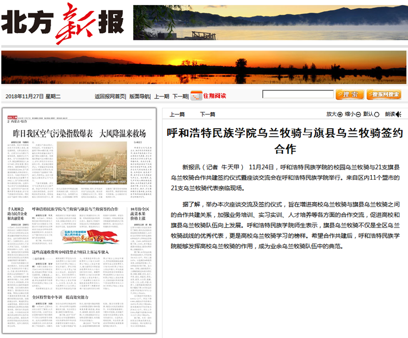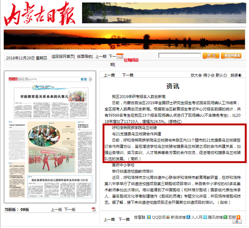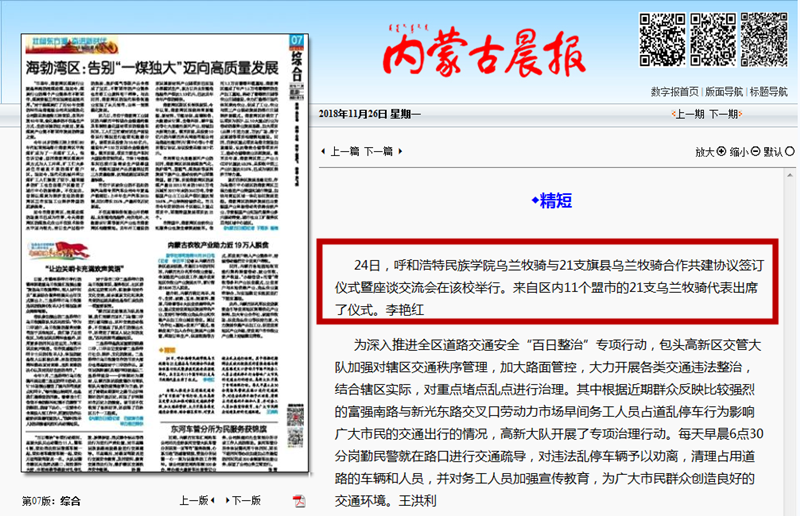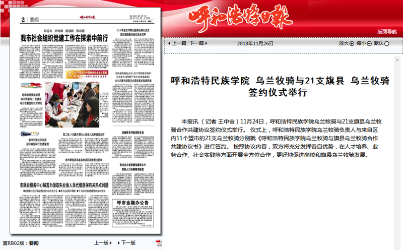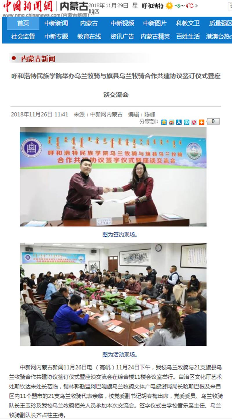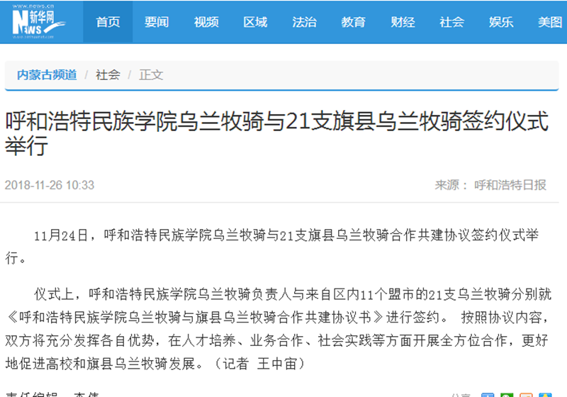 11月24日,365英国上市公司乌兰牧骑与21家旗县乌兰牧骑举行举行签字仪式,并就下一步合作共建进行交流座谈。连日来,内蒙古广播电视台、呼和浩特广播电视台、《内蒙古日报》(蒙汉文版)、《北方新报》、《呼和浩特日报》、《呼和浩特晚报》、新华网、中国新闻网、呼和浩特新闻网、呼和浩特广播电台等12家自治区主流媒体对活动进行了报道,内蒙古新闻网、新浪网等8家媒体进行了转载报道。通过媒体的广泛关注,进一步展示365英国上市公司乌兰牧骑队伍的风采,提高了365英国上市公司乌兰牧骑的影响力。