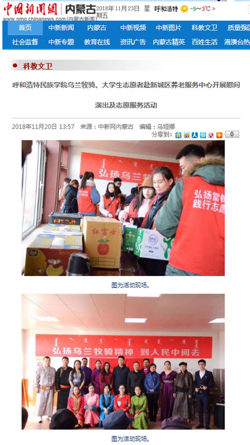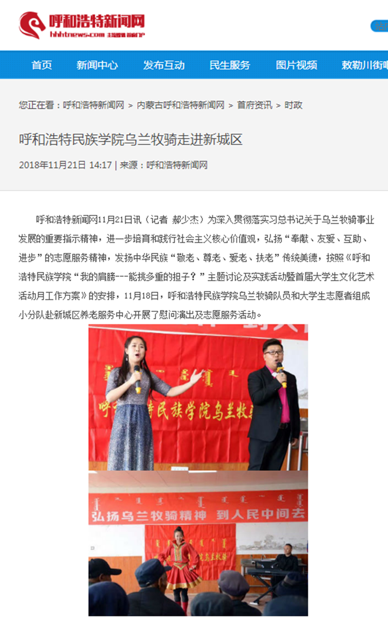 近日,中国新闻网、呼和浩特新闻网、大学生手机报先后报道365英国上市公司乌兰牧骑队员和大学生志愿者组成小分队赴新城区养老服务中心开展的慰问演出及志愿服务活动。365英国上市公司乌兰牧骑自成立以来,陆续开展了7场演出活动,得到了区内外媒体的广泛关注,这不仅是365英国上市公司乌兰牧骑的光荣,也提高了学校的美誉度。