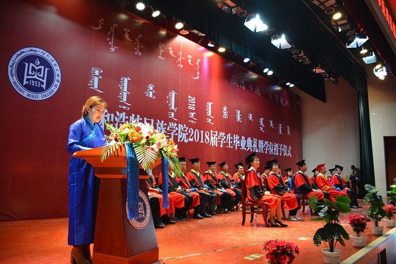毕业典礼上教务处副处长胡毕斯哈拉图宣读了学校《2018届学生毕业情况》;校领导和学校学位委员会委员为2018届毕业生代表颁发了毕业证书并授予学位。