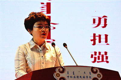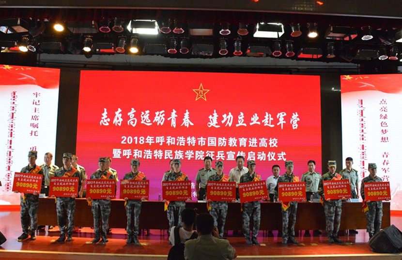 会上,胡春梅副书记首先代表学校党委致辞。随后,为2017年退伍复学大学生代表颁发退役士兵自主就业补助金。呼和浩特警备区孙炳文政委作呼和浩特市国防教育暨征兵宣传动员讲话。接着,与会人员还共同观看和聆听了呼和浩特警备区拍摄的《军营梦想、从青城出发》、《征兵政策解读》2部征兵宣传片和周涛等5名优秀退伍复学大学生的演讲。最后,学校精心编排的马头琴演奏、合唱、舞蹈表演把仪式带入了高潮。