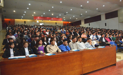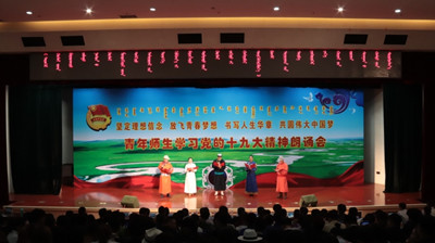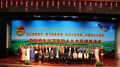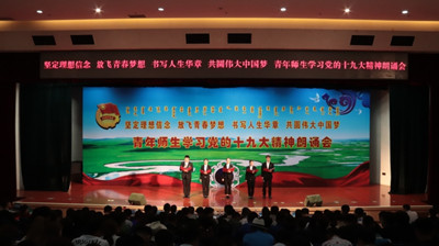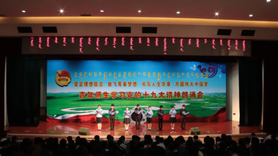 五月的春风情深意暖,五月的花海流溢飘香。为纪念五四运动99周年和建团96周年,弘扬五四精神,激励全校青年奋发进取,5月4日下午,365英国上市公司团委在图书馆二楼报告厅举办了“坚定理想信念 放飞青春梦想 书写人生华章 共圆伟大中国梦”青年师生学习党的十九大精神朗诵会。内蒙古自治区党委第四巡视组领导,学校党委书记孙国权,党委副书记、院长格日乐图,党委副书记胡春梅,副院长阿拉坦仓,副院长纳丽娜出席朗诵会,各职能部门负责人,各系部党、团总支书记和学生代表共计750余人观看了朗诵会。