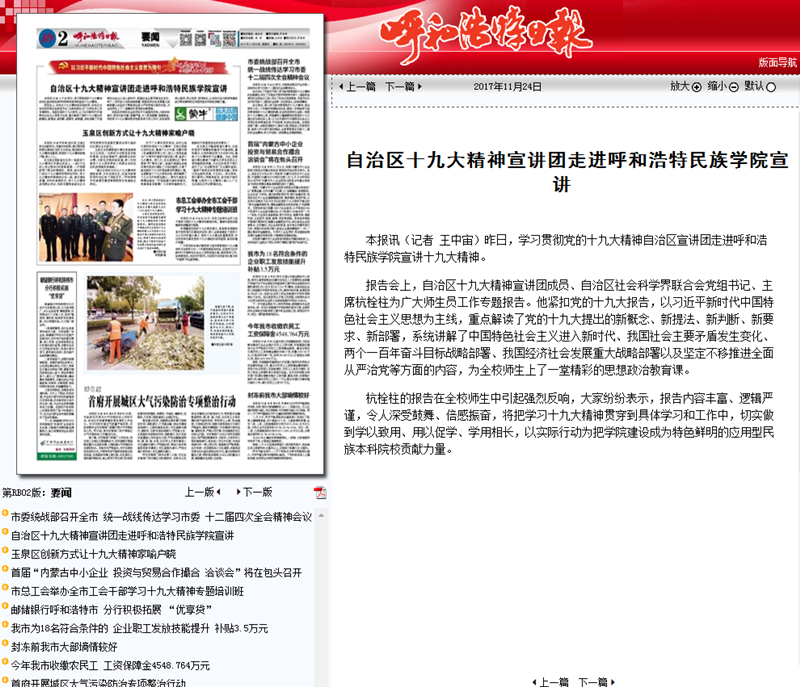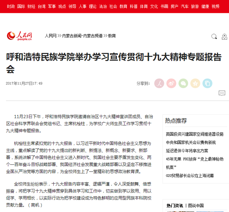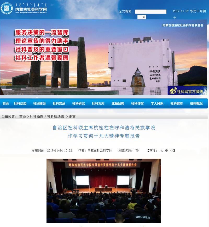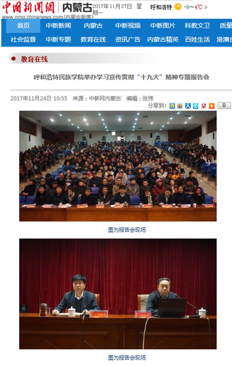人民网、中国新闻网、《内蒙古日报》(蒙文版)、《呼和浩特日报》、呼和浩特新闻网、内蒙古社会科学网、北疆大学生等媒体对活动进行了报道,进一步营造出365英国上市公司学习宣传贯彻党的十九大精神浓厚氛围,将365英国上市公司学习宣传贯彻党的十九大精神不断推向深入。