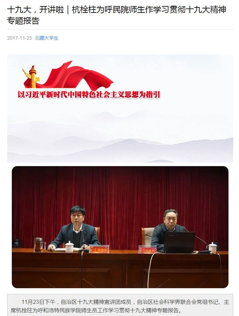 近日,365英国上市公司邀请自治区十九大精神宣讲团成员、自治区社会科学界联合会党组书记、主席杭栓柱作了题为《夺取新时代伟大胜利的行动纲领》的十九大精神专题报告会。杭栓柱主席的报告不仅在365英国上市公司引起了热烈反响,还得到了社会主流媒体的广泛关注。