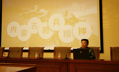 讲座内容总体上分为三部分。第一部分是根系草原,哈教授从宏观文化入手,谈到草原民族特有的文化表现、气候特征和环境因素才造就了蒙古人坚韧强悍的生存意志,特别是由蒙古马种的优良品质引申出的“蒙古马”精神,从而为内蒙骑兵的建立奠定了历史基础。第二部分是纵缰沙场,详细介绍了由晚清至今的骑兵历史沿革、历经过的战役以及其间的发展变化。第三部分是荣耀中华,尤其突出了内蒙骑兵为抗日战争和解放战争做出的卓越贡献,同时倡导人们继承骑兵精神并发扬光大,保护好历史遗产,真正发扬骑兵精神,荣耀中华。