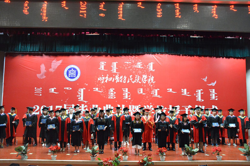 仪式上,教务处副处长胡毕斯哈拉图宣读了学校2017届学生毕业情况;全体学校领导为2017届毕业生颁发了毕业证书。学校学位委员会主任格日乐图院长及主席台领导为获得学士学位的毕业生代表授予学位并行拨穗礼。主席台上的每一位老师与毕业生握手祝贺、毕业快乐、拨穗行礼、合影留念,与同学们简短交流,祝福同学们前程似锦。