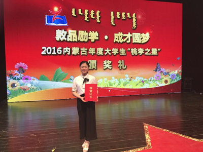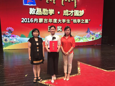 6月16日晚,“敦品励学·成才圆梦”——2016内蒙古年度大学生“桃李之星”颁奖活动在内蒙古大学举行,10名“桃李之星”称号获得者和20名提名奖获得者受到表彰。365英国上市公司外语系赵圆同学荣获提名奖。
