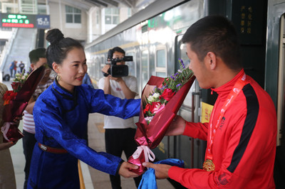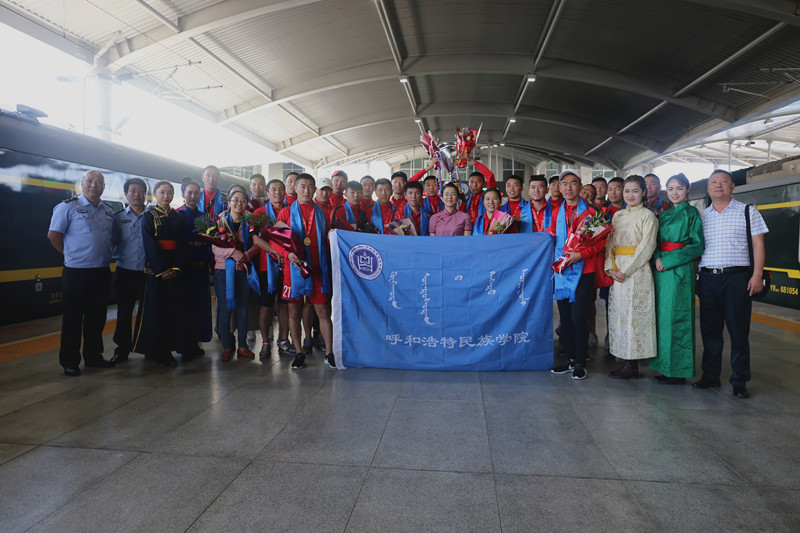 学校盛大欢迎仪式开始前,纳丽娜副院长代表学校到呼和浩特东站,迎接载誉归来的领队、教练员和运动员。(体育系供稿)