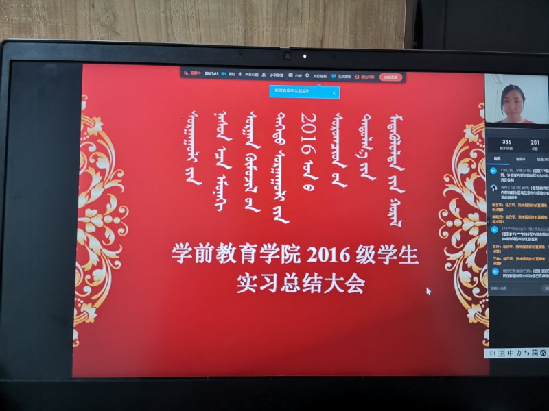 受疫情影响,4月30日晚7时,学前教育学院在线举办了2016级毕业生实习总结大会。会议由学前教育学院学前教育实践教研室主任乌日罕主持,学院党总支书记娜仁其木格、学前教育学院副书记其其格、团总支书记安梅琴、学前教育学院教学科研办公室主任朱乌英嘎等教师及我院全体学生参加。