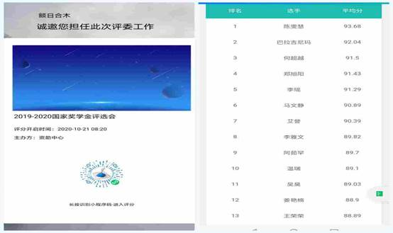 本次国家奖学金候选人总成绩=答辩成绩×50%+民主评议组成绩×20%+附加分总分×30%,附加分总分是根据学生专业综合测评成绩排名,班级综合测评成绩排名,学分绩点,获奖情况,过级证书等情况计算而成。今年答辩中民主评议组成员在线上完成了评分工作。
