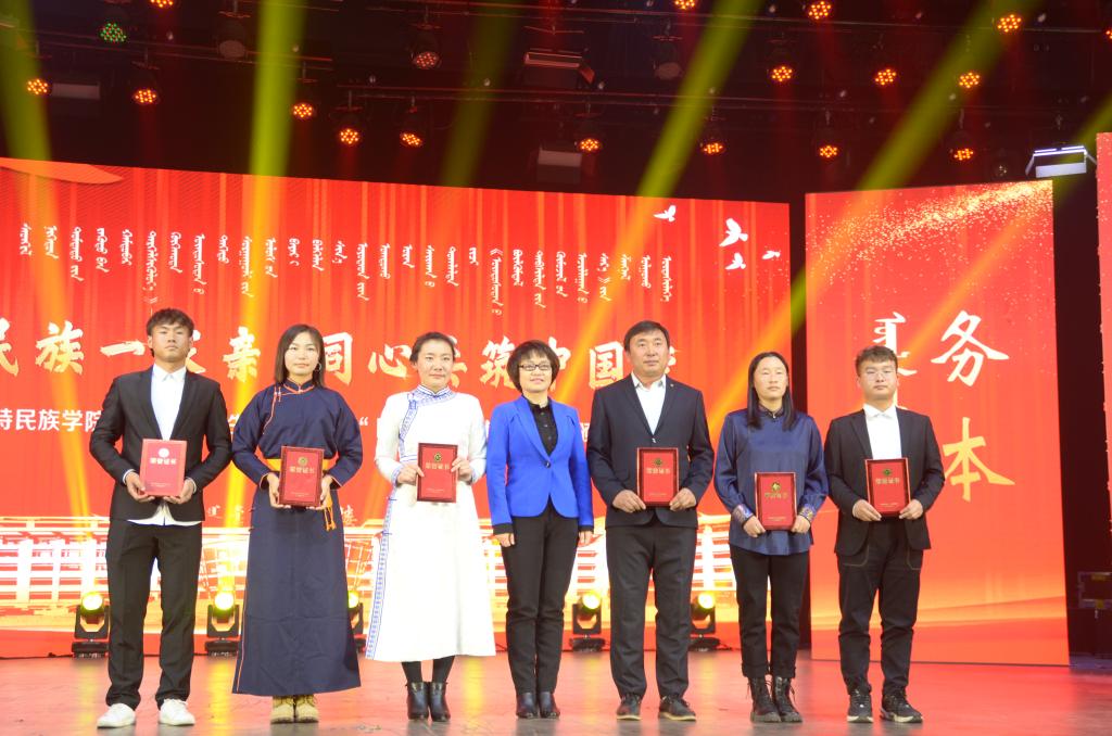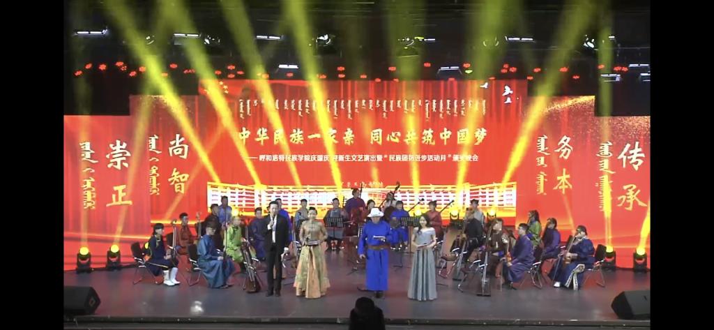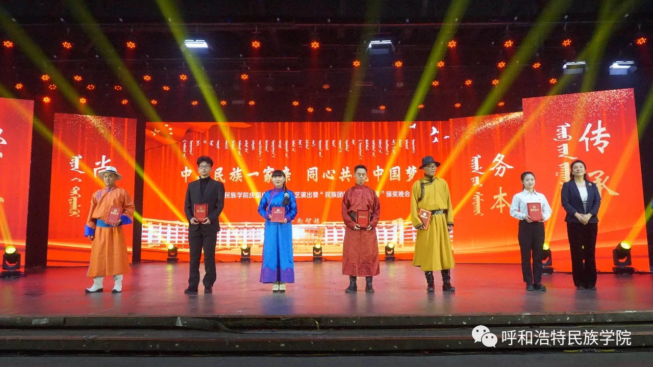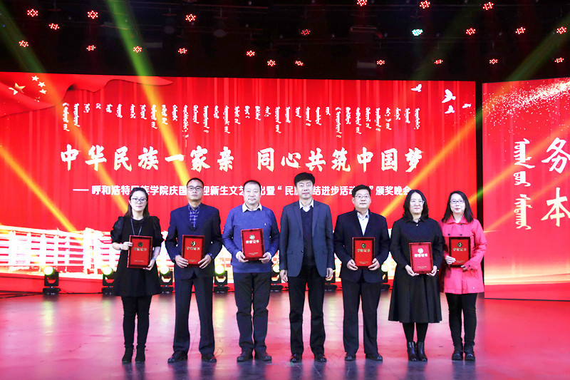 歌舞萦绕,红旗飘扬,10月25日晚7时,365英国上市公司“中华民族一家亲 同心共筑中国梦”庆国庆、迎新生文艺演出暨“民族团结进步活动月”颁奖晚会在学校演播厅及图书馆报告厅同时举行。内蒙古自治区民族事务委员会党组成员、副主任特木勒、呼和浩特市民委四级调研员闫青、呼和浩特市民委社会发展科科长斯日古楞、学校领导、处级以上干部、受表彰集体和个人、师生代表齐聚一堂,共同观看了演出。