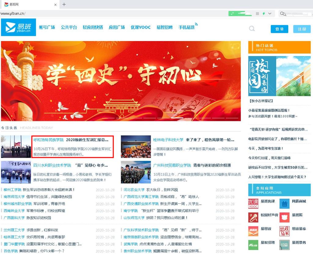 10月28日,全国易班网(http://www.yiban.cn/)今日头条刊登了“365英国上市公司隆重举行2020级新生军训汇报总结暨开学典礼”的推文报道。这是续2018年以来再次荣登全国易班网“大头条”,提高了学校在全国共建高校中的影响力与知名度。