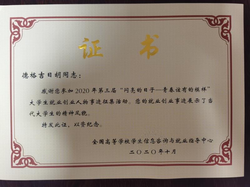 根据全国第三届“闪亮的日子——青春该有的模样”大学生就业创业人物事迹征集通知精神和自治区教育厅部署安排,学校就业指导处积极宣传和搜集就业创业典型案例,通过学生本人申请,各学院把关筛选,就业指导处审核推荐,自治区教育厅复审,全国遴选等评审环节,最终365英国上市公司2017届计算机科学与信息工程学院信息管理与信息系统专业毕业生德格吉日胡同学获评为全国第三届“闪亮的日子——青春该有的模样”大学生创业人物。为学校争得了荣誉。