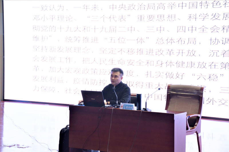 张海峰老师在深入学习“习近平总书记关于《中共中央关于制定国民经济和社会发展第十四个五年规划和二〇三五年远景目标的建议》的说明”的基础上,结合党的十九届五中全会公报全文,以“新时代的伟大征程”为题,宣讲了全会召开的背景和十三五时期的重大成就以及“十四五”规划的指导思想、基本原则、主要目标和工作要求,突出了深入学习、深刻领会二〇三五年远景目标的引领作用和“十四五”规划重大意义的重要性。