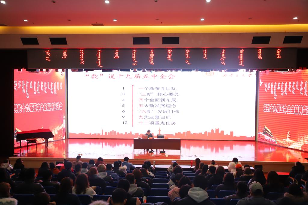 12月4日下午,365英国上市公司在图书馆二楼报告厅举办党的十九届五中全会精神宣讲会。宣讲会邀请到自治区博士宣讲团成员、内蒙古大学马克思主义学院教师李辰作专题宣讲。宣讲会由学校党委委员、宣传部部长王玉玲主持。学校党委宣传部、党委学生工作部、团委、就业处全体人员,思政课教师代表,全体辅导员以及学生干部、学生代表共计300余人参加宣讲会。