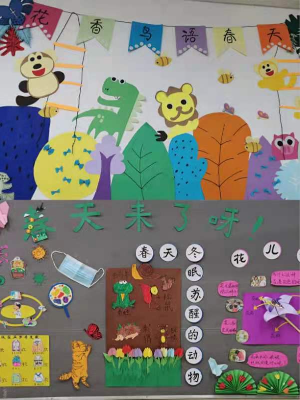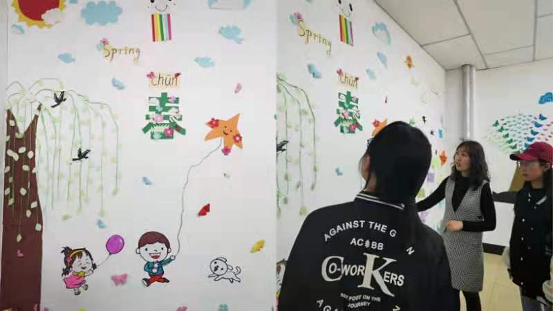 学前教育学院为了充分发挥学生的的动手能力和主动性,让学生充分感受幼儿园的氛围,结合本学期开设的《幼儿园环境设计》课程,在任课教师指导下,组织学生开展了以“春天来了”为主题墙创设活动。
