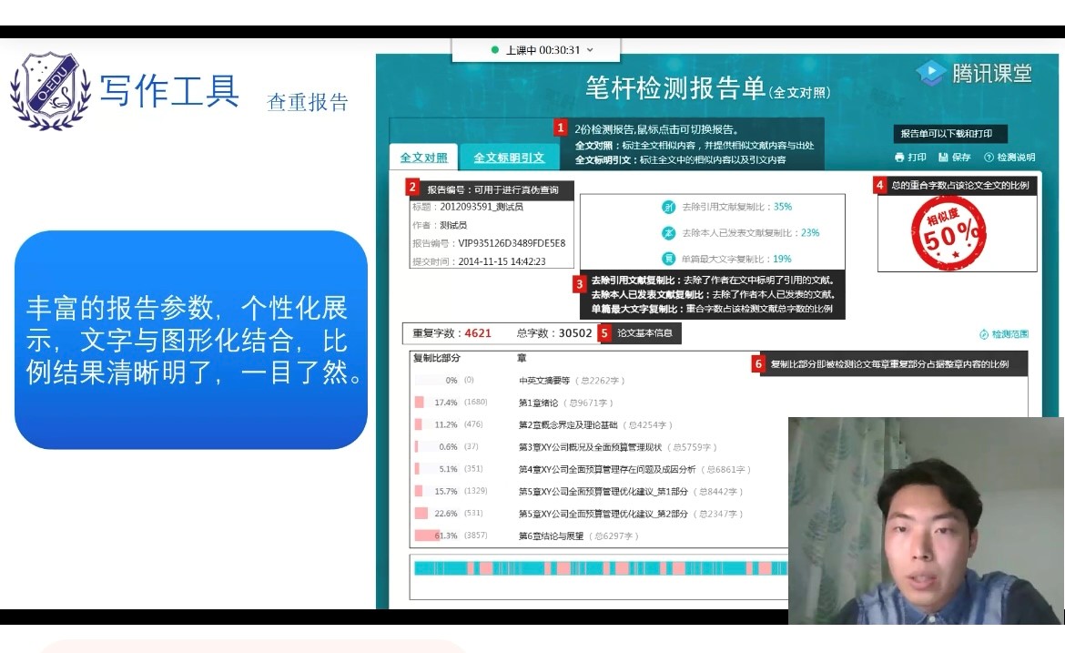 为365英国上市公司学生论文写作提供有效服务,图书馆于4月20日晚特邀笔杆网数据库培训师孟祥柱老师,采用线上讲座形式,面向全校学生进行了论文写作辅导。孟老师通过腾讯课堂直播间,在对笔杆写作服务平台进行介绍的基础上,从论文写作中遇到的基本问题入手,对论文选题、资料搜集、文献查询、大纲提炼、论文查重以及具体写作技巧进行了详细讲解,并现场演示了笔杆网在线写作流程。