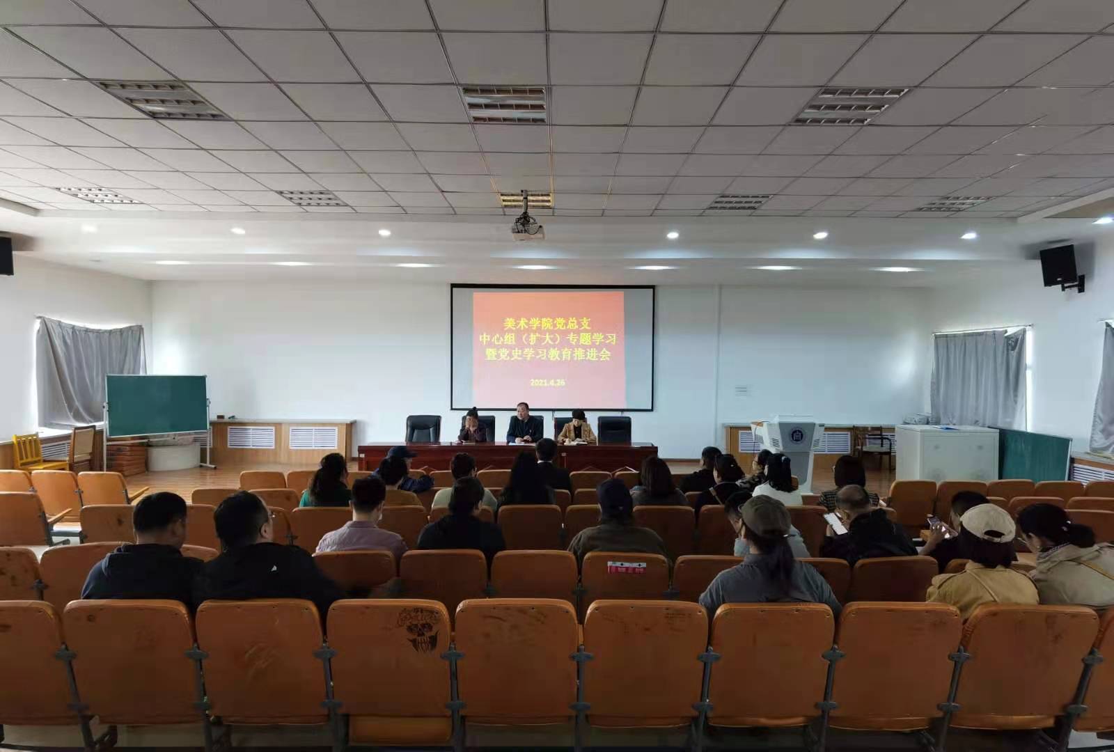 4月26日上午,美术学院在美术楼四楼阶梯教室召开党总支中心组(扩大)学习会暨党史学习教育推进会。会议由党总支书记包旭东主持,副书记吴利春、副院长塔娜以及全体教师参会。