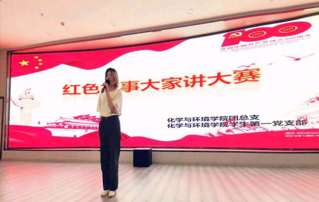 为庆祝建党一百周年,进一步深化学院学生党员和团员青年的党史学习教育宣传,大力弘扬红色精神,传承红色基因,化学与环境学院“红色故事大家讲”演讲比赛于5月18日在图书馆一楼报告厅拉开帷幕,100余名同学观看了比赛。比赛由化学与环境学院团总支和学生第一党支部联合举办,共有14组参赛选手参加了本次大赛。