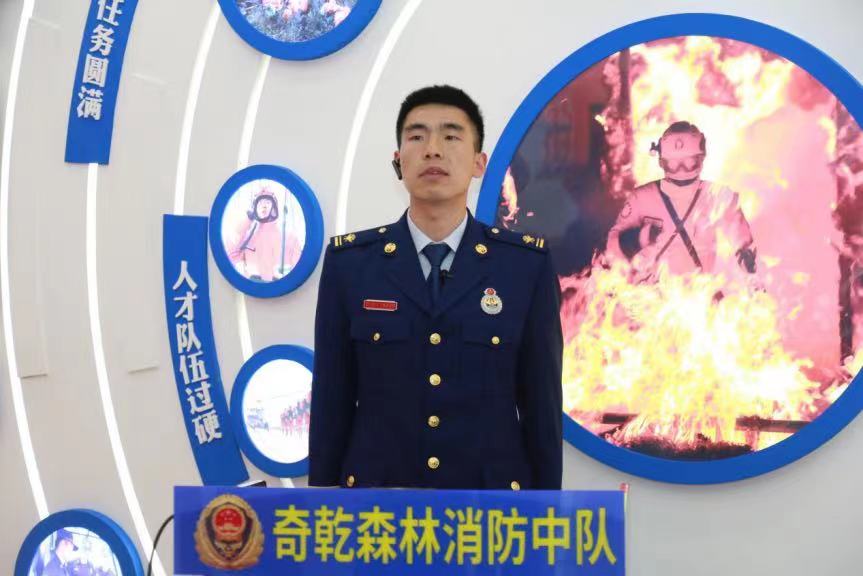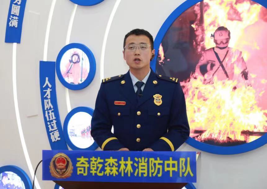 奇乾中队班长高凯凯以“奋斗,最苦的地方最热的血”为主题,分享了中队指战员经受林海孤岛森林救火的艰难考验,传承忠诚、坚守、创业、乐观”的奇乾精神,做好党和人民忠诚“守夜人”的感人故事。