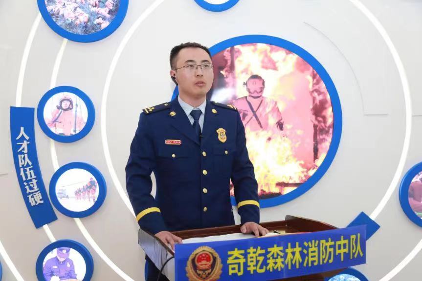 奇乾中队中队长王永刚以“担当,挺进林海深处的橙色尖刀”为主题,讲述了队伍注重思想政治教育,科学规划业务训练,推动队伍转型强能落实落细的宝贵经验。