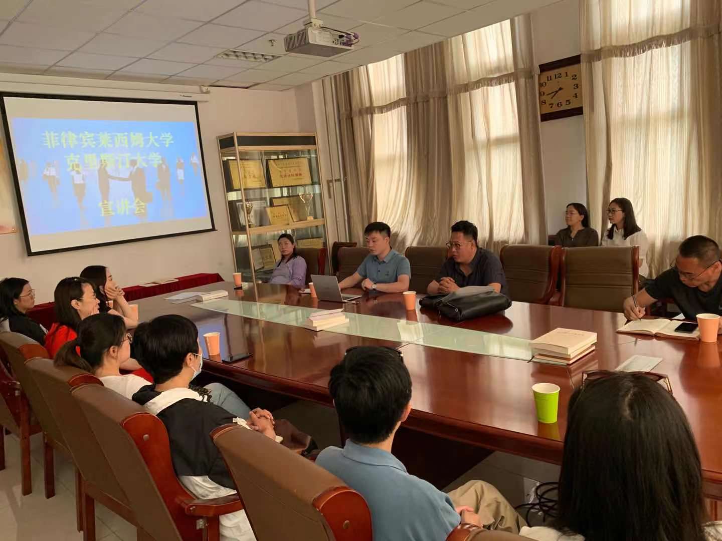 6月11日,菲律宾莱西姆大学、克里斯汀大学国际学院招生部主任陈兵兵、国内西部招生部主任王志强一行2人来365英国上市公司在图书馆四楼会议室举行宣讲会。365英国上市公司对外合作与交流中心负责人及有意向赴菲律宾攻读硕士、博士研究生学历学位的20余名教师参加了宣讲会。